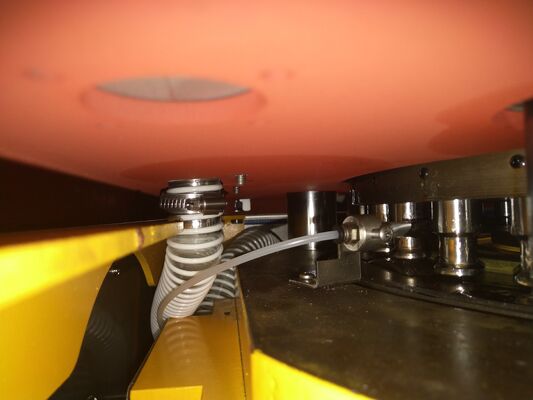 7. Jako pierwszy w swoim rodzaju zastosowano półautomatyczny sprzęt smarujący i osłonę przeciwpyłową z pleksiglasu na górnej części stołu obrotowego.