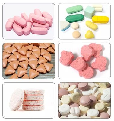 3. Maszyna może prasować nie tylko okrągłe tabletki, ale także tabletki o różnych kształtach geometrycznych, tabletki dwuwarstwowe i pierścieniowe, tabletki mogą mieć wytłoczone litery po obu stronach.